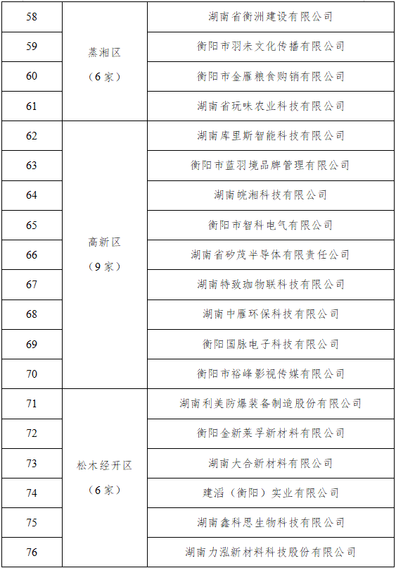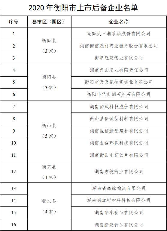 根据刚刚印发的《衡阳市人民政府办公室关于公布2020年衡阳市上市后备及培育企业名单的通知》,湖南大三湘茶油股份有限公司等45家企业入选“2020年衡阳市上市后备企业名单”,湖南省矽茂半导体有限责任公司等100家企业入选“2020年衡阳市上市培育企业名单”。