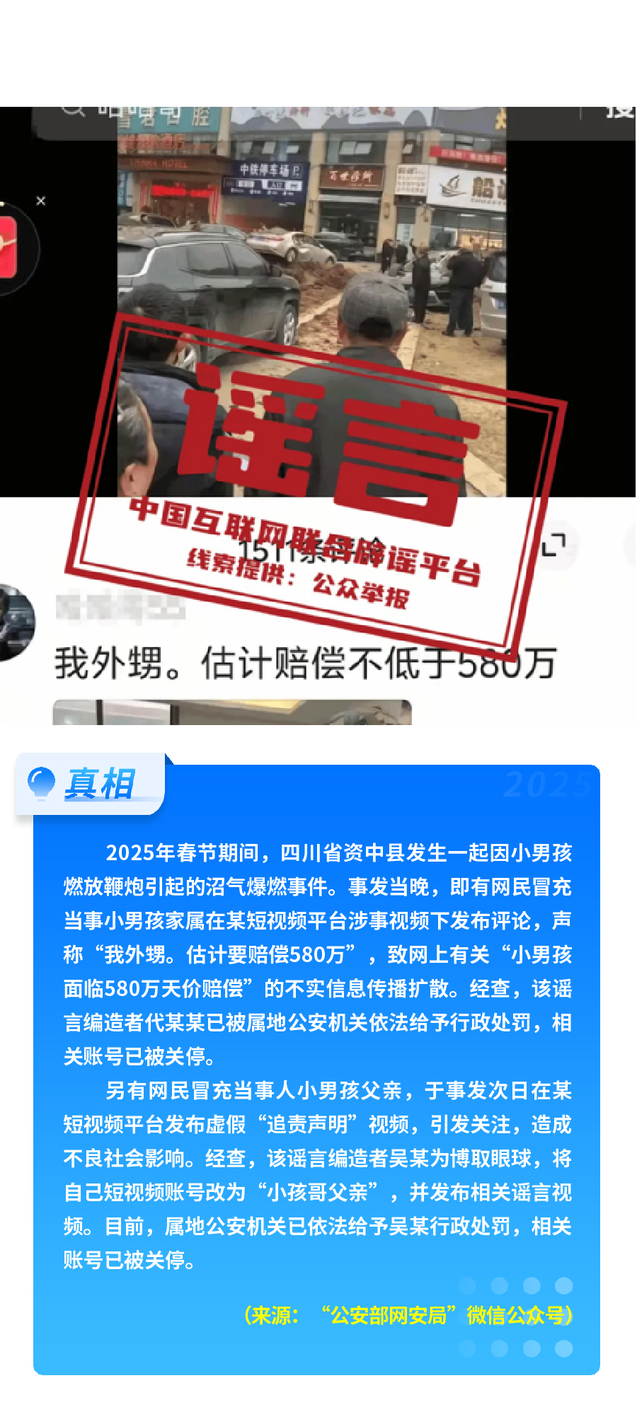 杜撰灾害事故谣言扰乱秩序。2月上旬,各类灾害事故频发,四川宜宾筠连山体滑坡、四川资中沼气爆燃等事件均备受社会关注,部分自媒体账号趁机散布谣言、博取流量。如“四川宜宾筠连山体滑坡被行车记录仪拍下”“4名遇险学生被路过的司机救出”等帖文,嫁接旧闻、翻炒拼凑,扰乱社会公共秩序,给抢险救灾工作带来极大困扰。“放鞭炮引起沼气爆燃的男孩面临580万赔偿”“男孩家属发布追责声明”等不实信息,系部分网民在并无事实依据情况下肆意编造传播,给当事各方造成伤害,产生不良社会影响。此外,还有网民随意散布“广州地铁三号线着火”“一架飞机坠落海南东方”“广东江门某码头两船相撞”等涉灾害事故类谣言,干扰正常社会秩序,给欢乐祥和的节日氛围蒙上阴影。