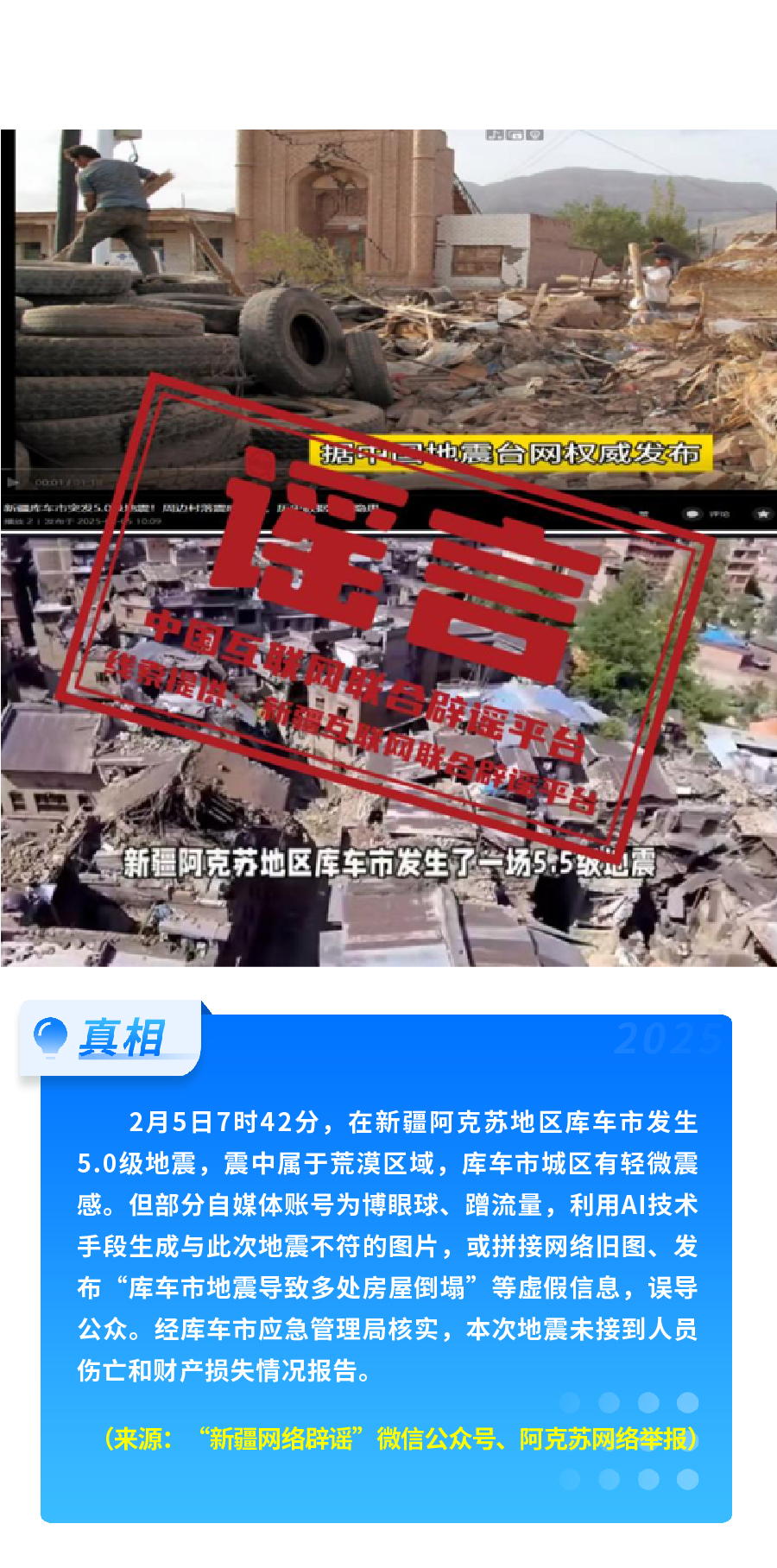 利用AI技术造谣混淆视听。近期,随着DeepSeek横空出世,各类AI应用爆发式增长,便利人们工作、生活的同时,亦有个别不法分子利用AI技术无中生有、设局行骗、炮制谣言。如有部分平台声称通过“大数据分析”或“AI模型”可预测彩票中奖号、提高中奖率,诱导用户付费或点击外链,违法行径严重侵害消费者权益,中国体育彩票迅速辟谣“再强大的AI也无法预测中奖号码”。新疆库车5.0级地震发生后,部分自媒体账号为博眼球、蹭流量,利用AI技术手段生成与此次地震不符的图片,在网上发布“库车市地震导致多处房屋倒塌”的图文、音视频等虚假信息,严重误导公众认知。还有个别网民利用AI技术生成涉校园“火灾”特效,编造“河南清丰县第二初级中学着火”“云南迪庆香格里拉一中、三中着火”“山西忻州市某中学发生火灾”等虚假信息,严重混淆视听。