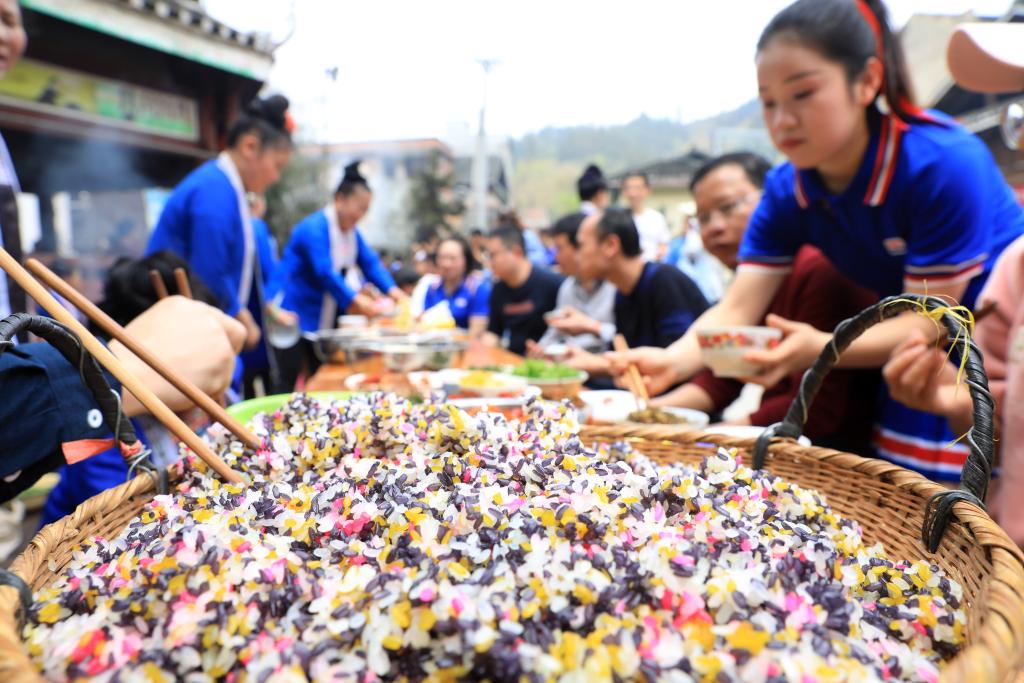 ▲侗族村民制作五色糯米饭招待宾客。杨代富 摄