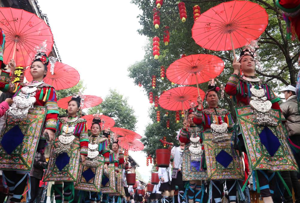 ▲肇兴侗寨侗族群众盛装参加侗年巡游。杨代富 摄