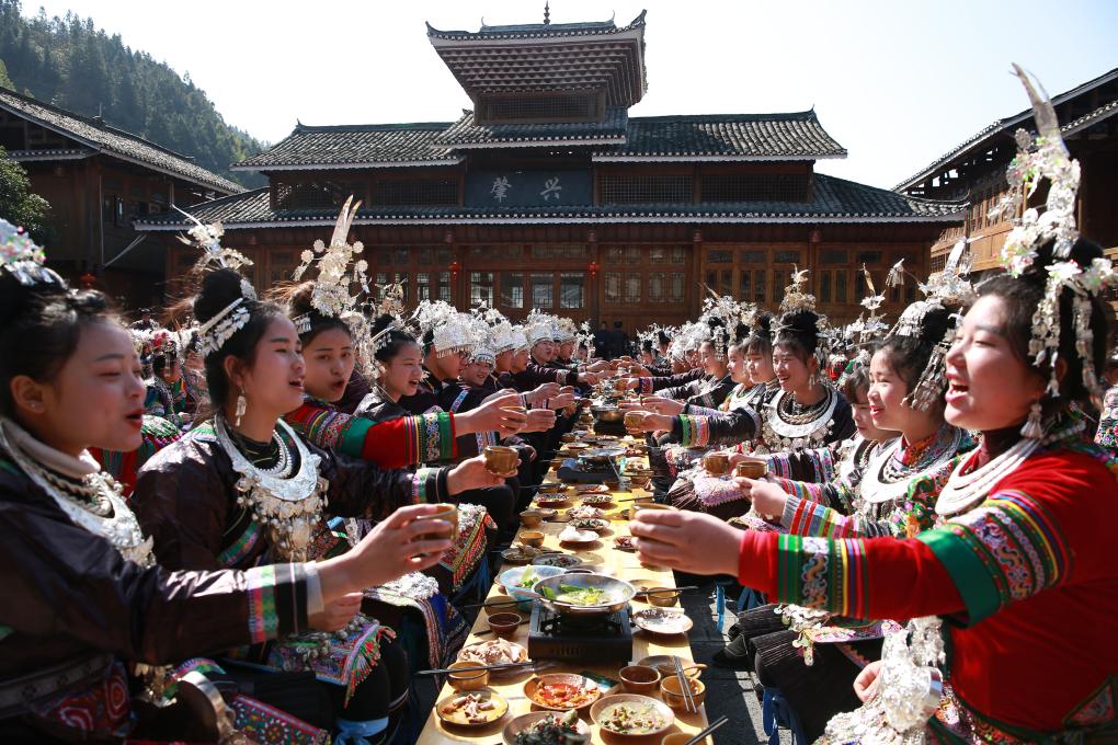 ▲侗族群众围坐一起吃长桌宴。杨代富 摄