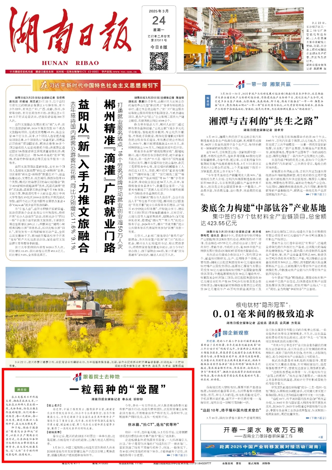 即日起,湖南日报推出《跟着院士去种地》栏目,以农业生产周期全记录形式,记录邹学校和柏连阳两位院士带领团队不懈努力,让大家吃健康米饭、过“火辣”日子的科研攻坚进程。敬请关注。