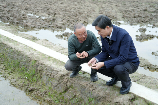 3月20日,中国工程院院士柏连阳团队科研人员来到湖南省岳阳市屈原管理区高产示范田田埂上观察农情,提醒在场农户重视播种育秧环节。