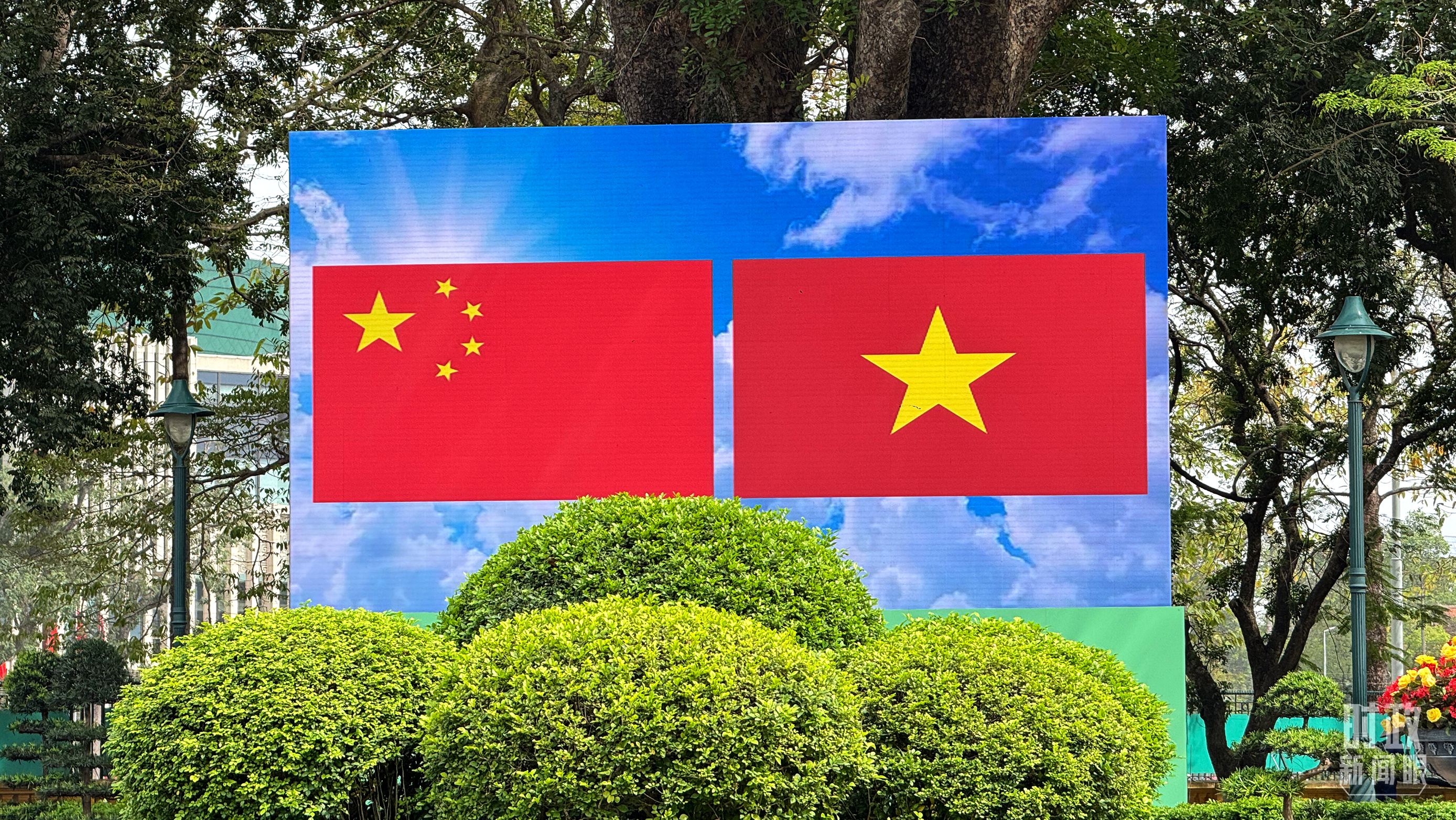 ▲欢迎仪式现场大屏幕上展示的中越两国国旗。(总台央视记者蒋硕拍摄)
