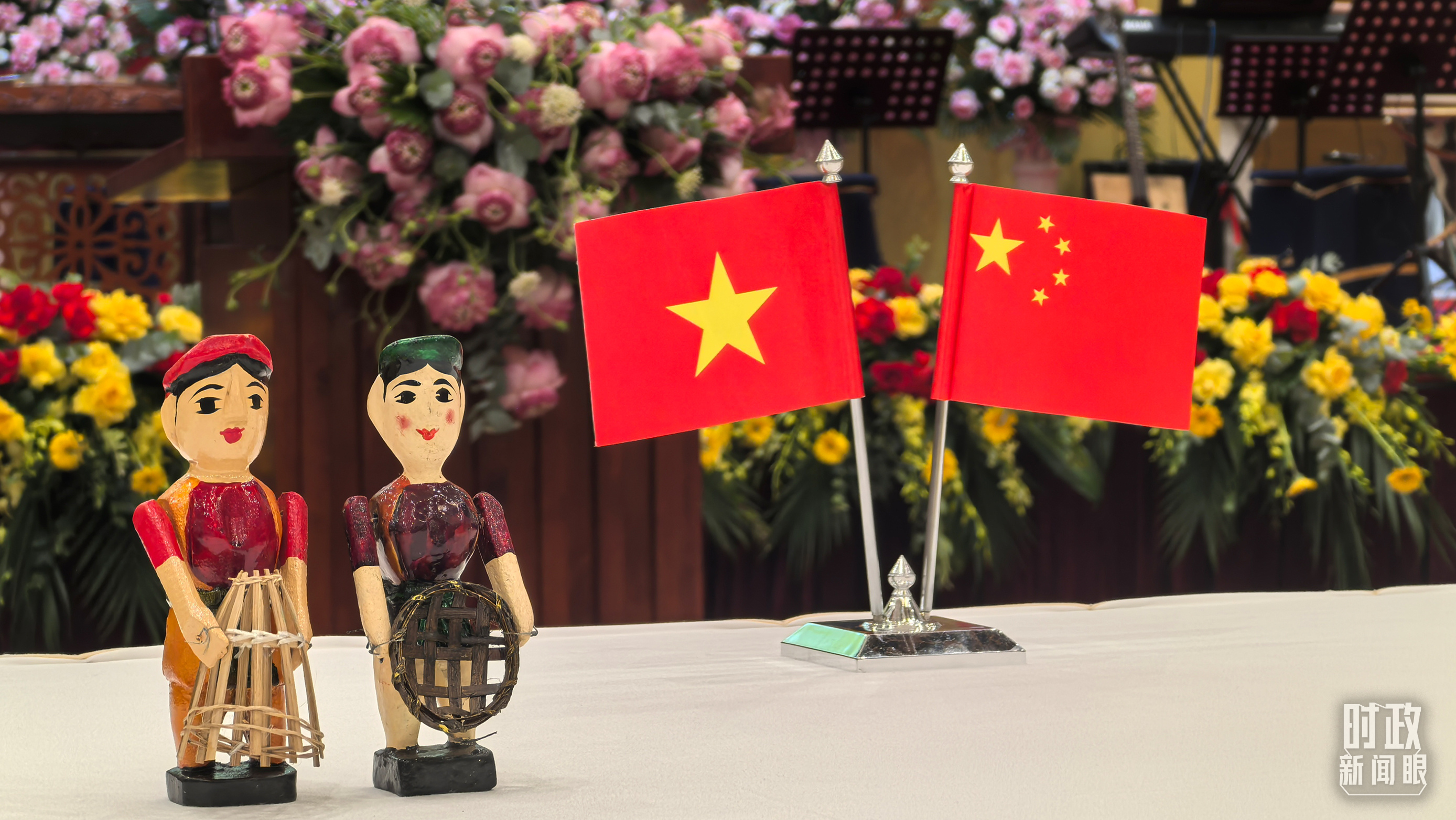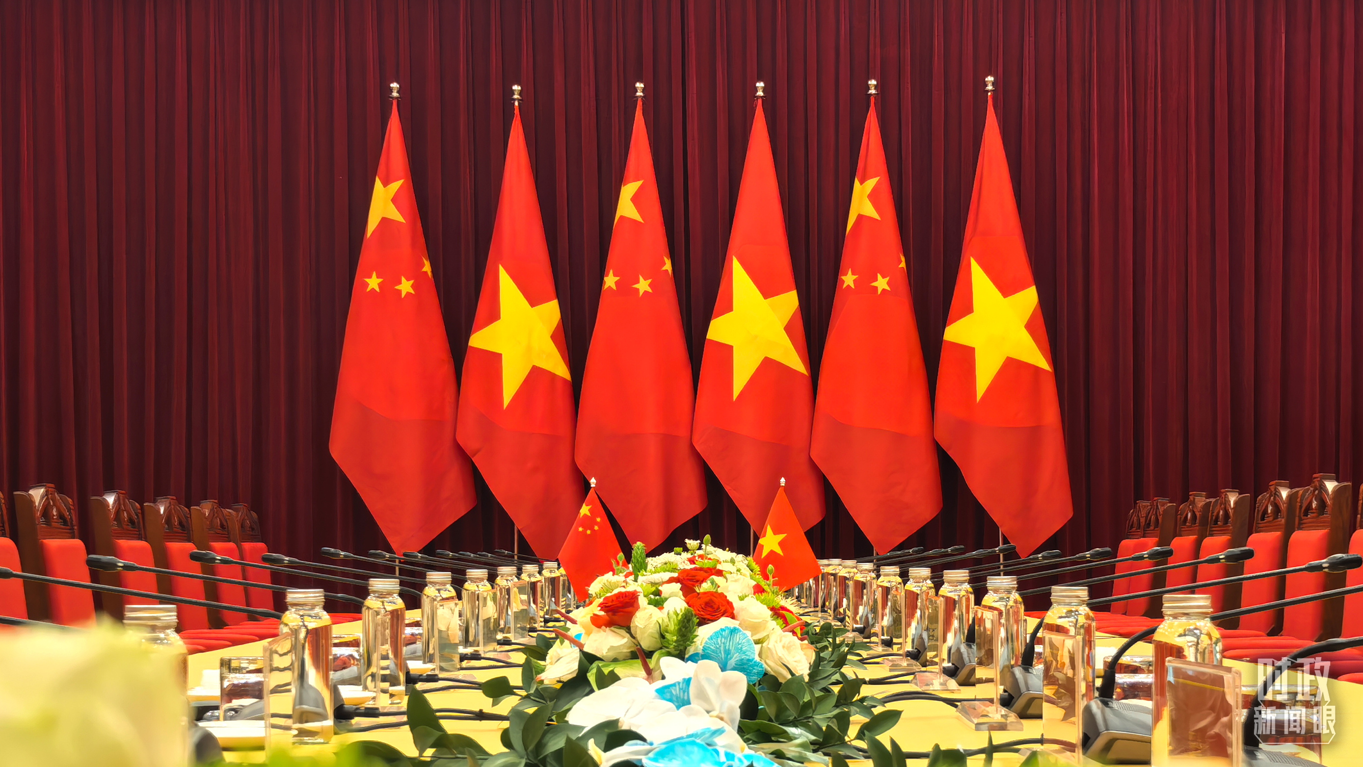 ▲欢迎宴会现场摆放的中越两国国旗。(总台央视记者鄂介甫拍摄)