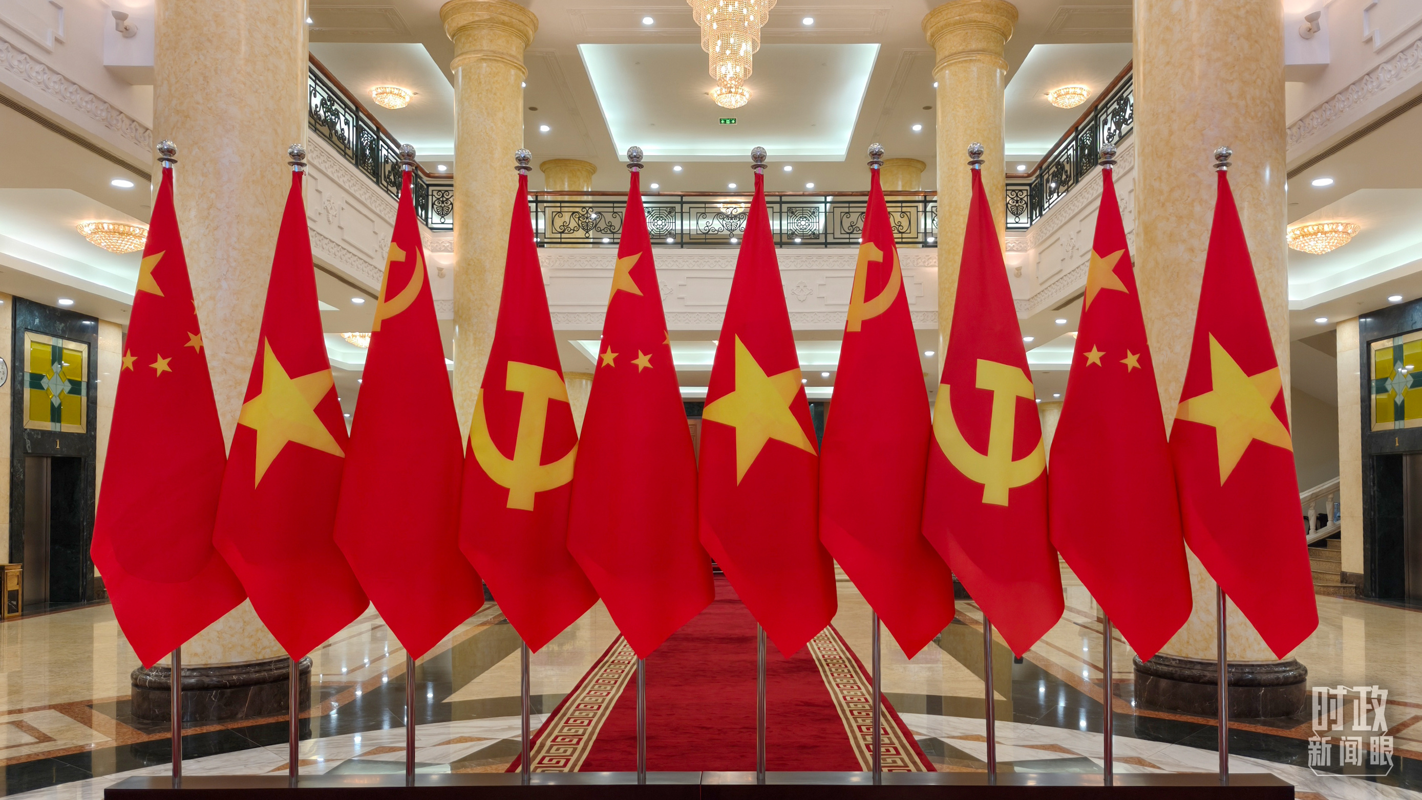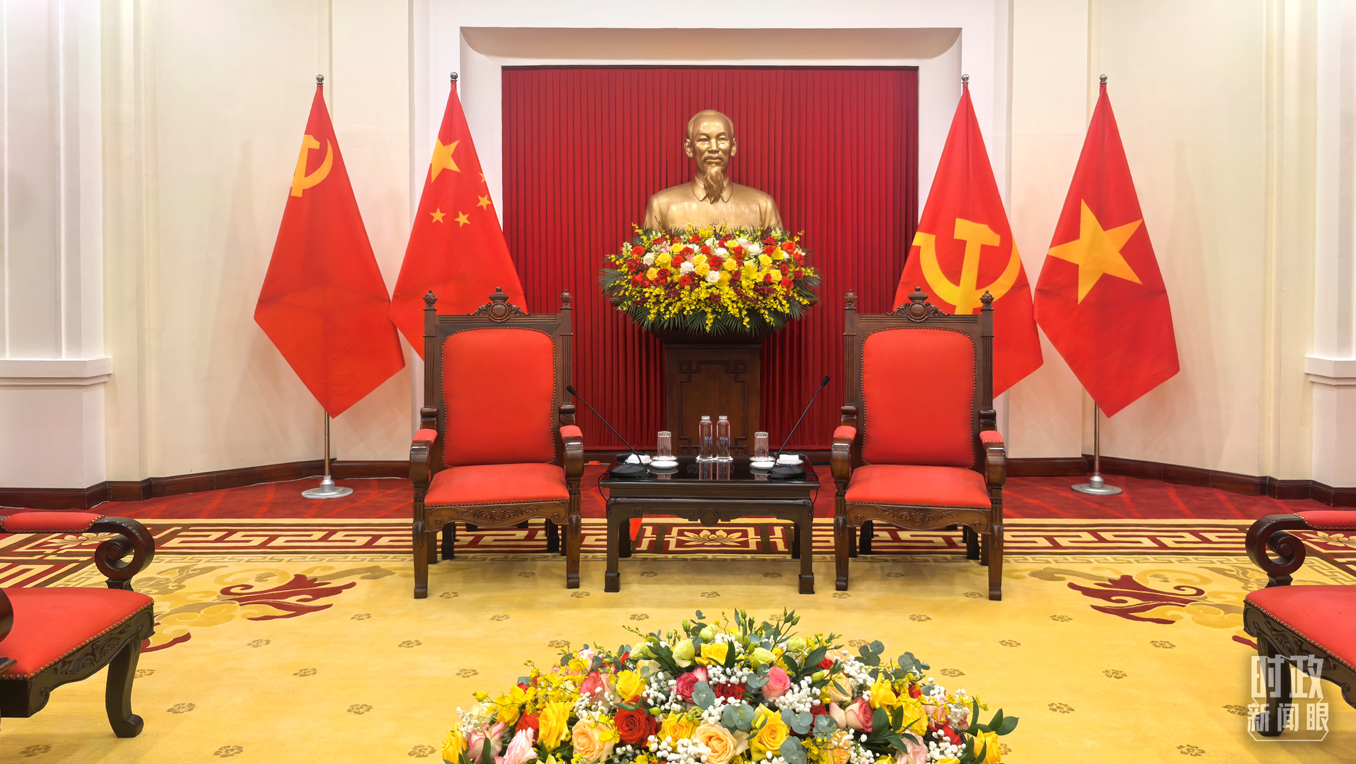 ▲越共中央驻地摆放的中越两党两国旗帜。(总台央视记者杨立峰拍摄)