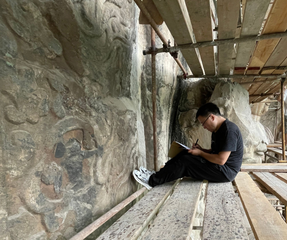 习近平总书记来到龙门石窟时,龙门石窟研究院考古研究中心工作人员谷宏耀正和其他部门同事共同对石窟进行调查记录。