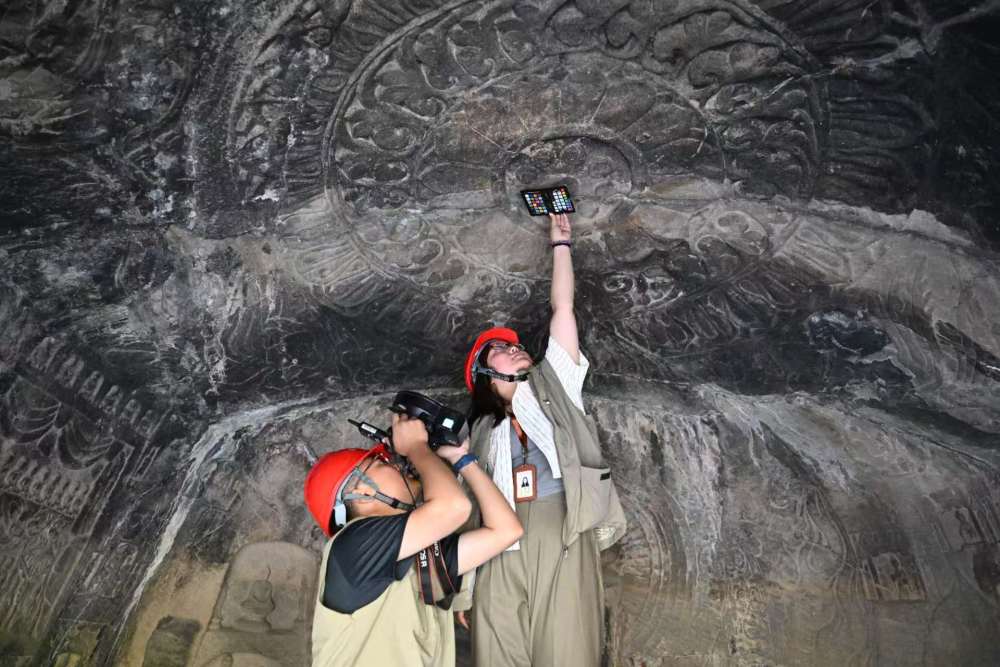 ▲4月10日,龙门石窟研究院工作人员(右)与武汉大学文化遗产智能计算实验室团队成员一同对龙门石窟魏字洞进行高清摄影扫描。新华社记者 李嘉南 摄