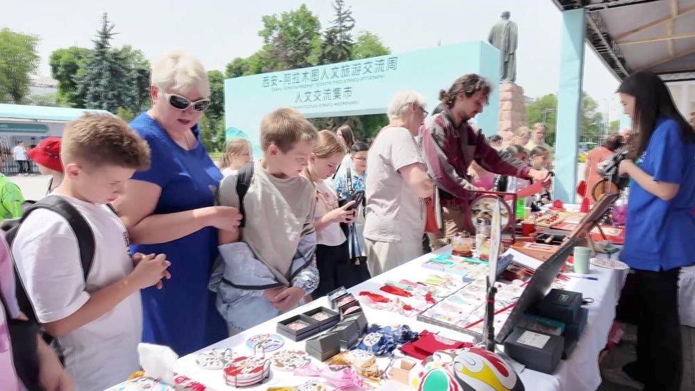 ▲2025年6月2日,人文交流集市在哈萨克斯坦阿拉木图市中心的广场拉开帷幕,非遗技艺、文创产品、中医药知识普及等丰富多彩的活动吸引了众多当地民众。