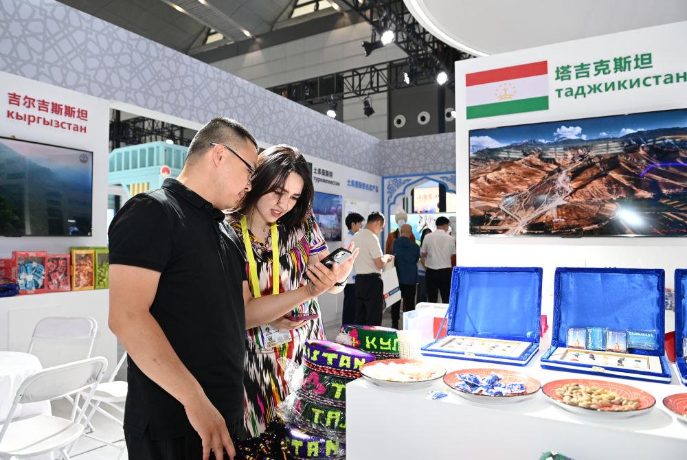 ▲2025年5月21日,在第九届丝绸之路国际博览会暨中国东西部合作与投资贸易洽谈会丝路优品展上,参观者了解塔吉克斯坦商品。