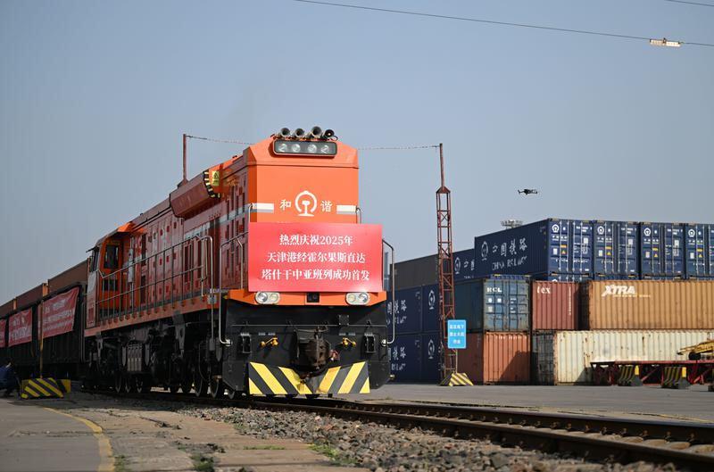 ▲5月20日,2025年首列天津港经霍尔果斯直达塔什干的中亚班列从天津港物捷三堆场发车。