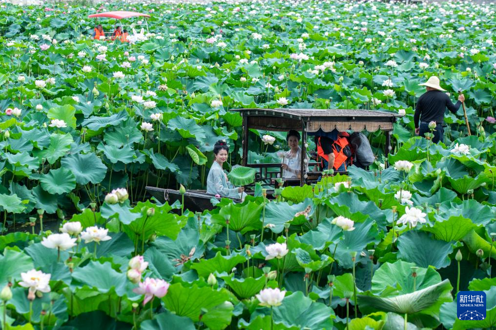 ▲7月12日,游客在湖南省娄底市娄星区青山公园泛舟赏荷。图片来源:新华社