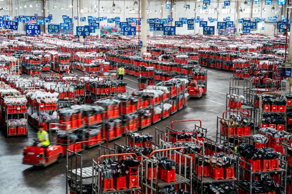 ▲台车在昆明国际花卉拍卖交易中心内转运鲜花(7月9日摄)。新华社记者 胡超 摄