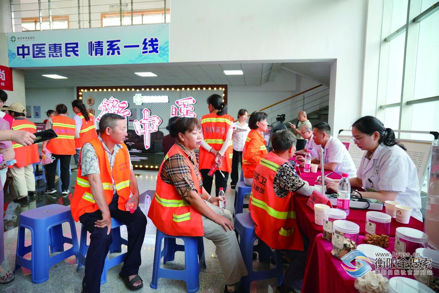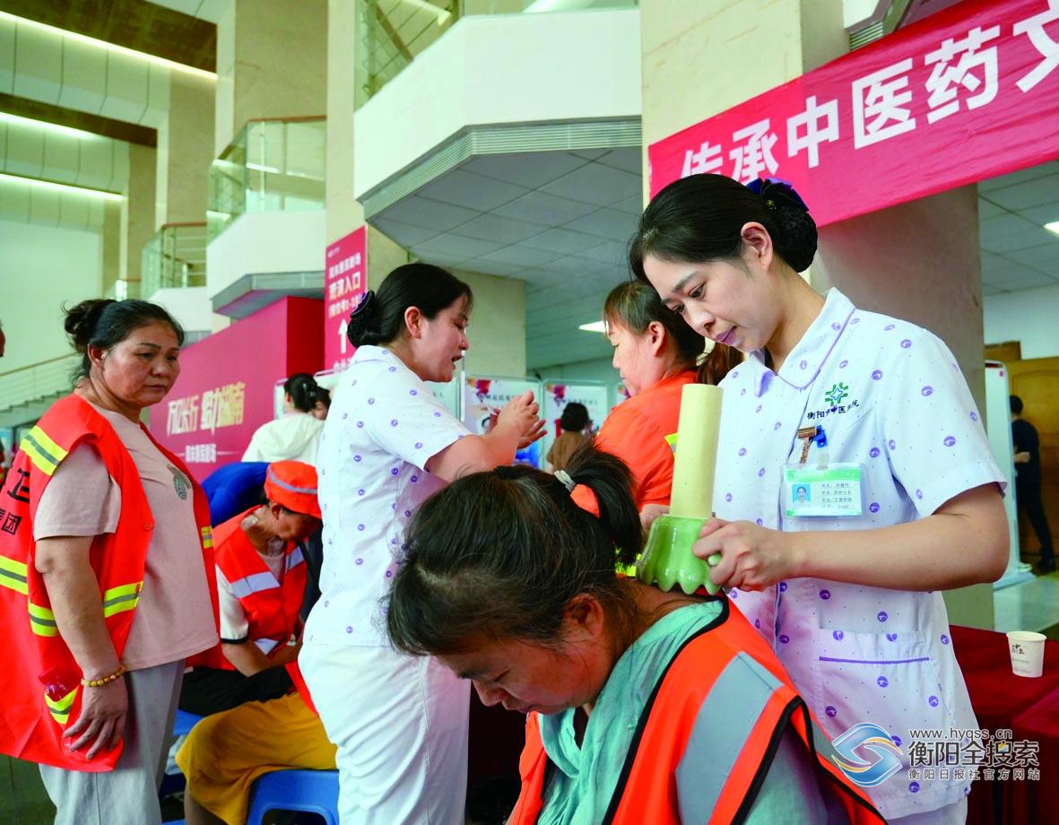 剧场外,市中医医院为环卫工人免费提供健康问诊、养生茶饮品尝和推拿按摩等公益服务。