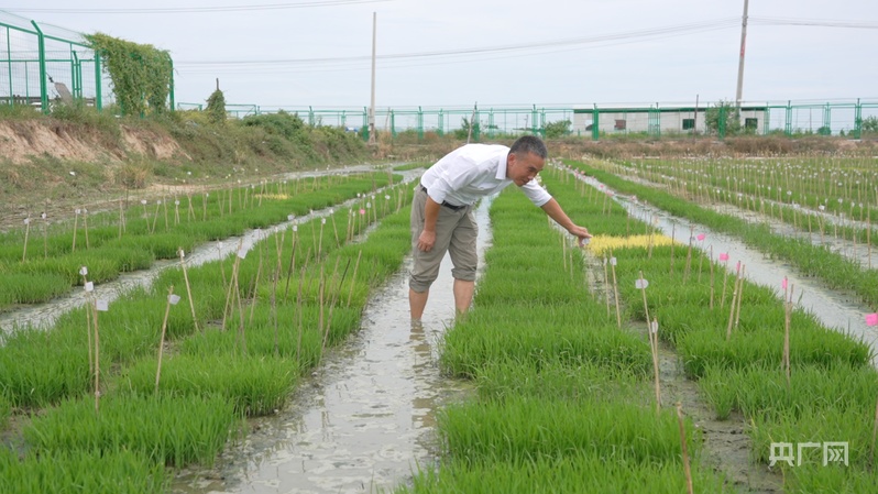 ▲王仕明观察不同品种水稻的生长情况(央广网记者 索迪 摄)
