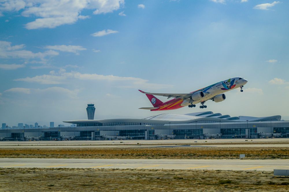 ▲9月15日,一架飞机从乌鲁木齐天山国际机场起飞。新华社记者 陈朔 摄