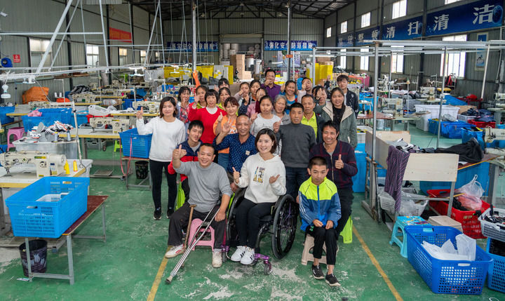 ▲2020年10月13日,在湖南省邵阳市城步县湖南七七科技股份有限公司生产车间,杨淑亭(前排中)与工友合影。新华社记者 才扬 摄