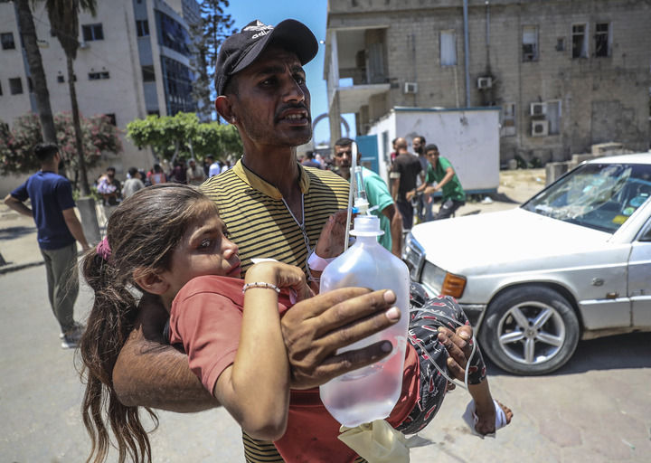 ▲2025年7月13日,在加沙城一所医院,一名男子怀抱在以军空袭中受伤的女孩。新华社发(马哈茂德·扎基摄)