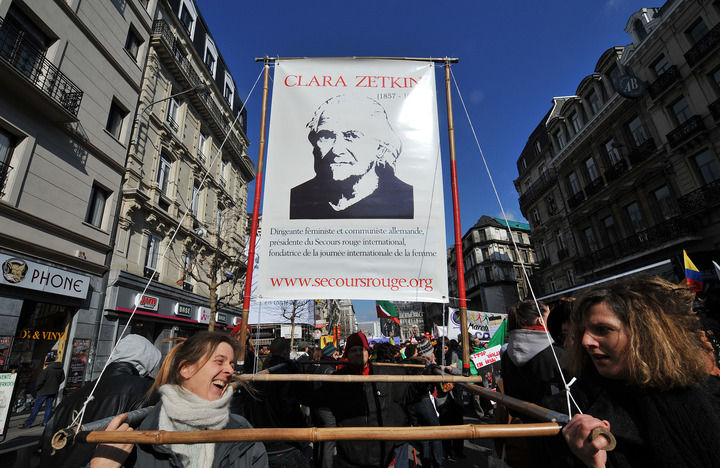 ▲2010年3月6日,在比利时首都布鲁塞尔,妇女代表抬着著名女政治活动家、三八国际妇女节的倡导者克拉拉·蔡特金的画像参加庆祝三八国际劳动妇女节游行。新华社记者 武巍 摄