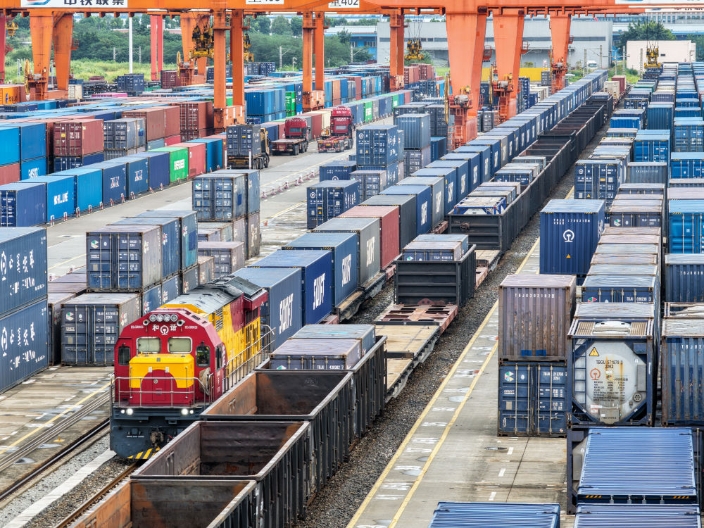 ▲2025年9月8日,满载“重庆造”汽车的中欧班列(成渝)在重庆团结村中心站等待发车(无人机照片)。新华社记者 唐奕 摄