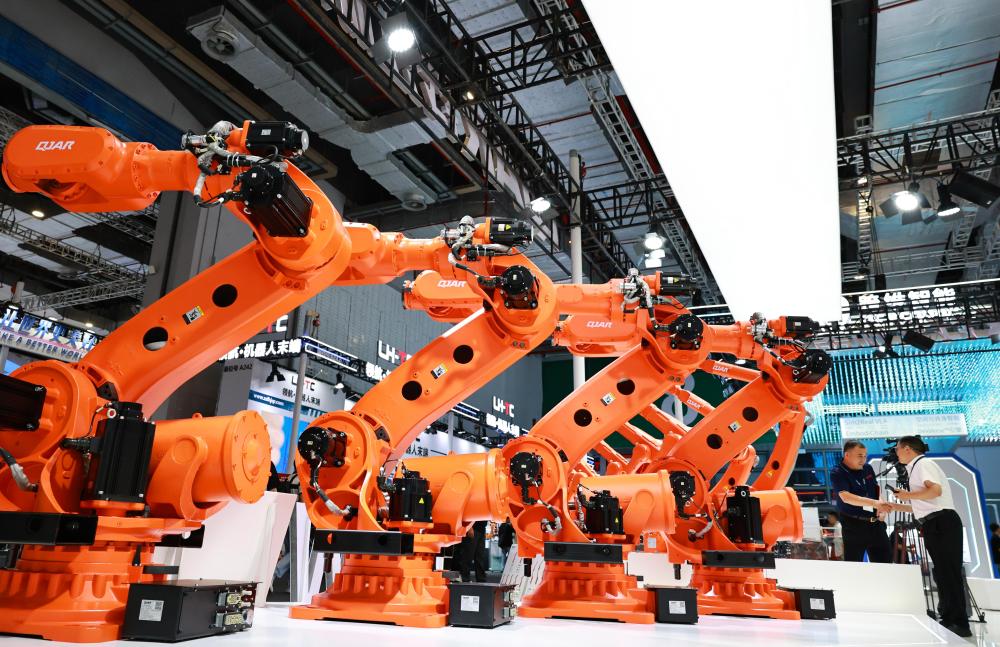 ▲这是2025年9月23日在上海举行的第25届中国国际工业博览会上拍摄的一组大型工业机器人产品。新华社记者 方喆 摄