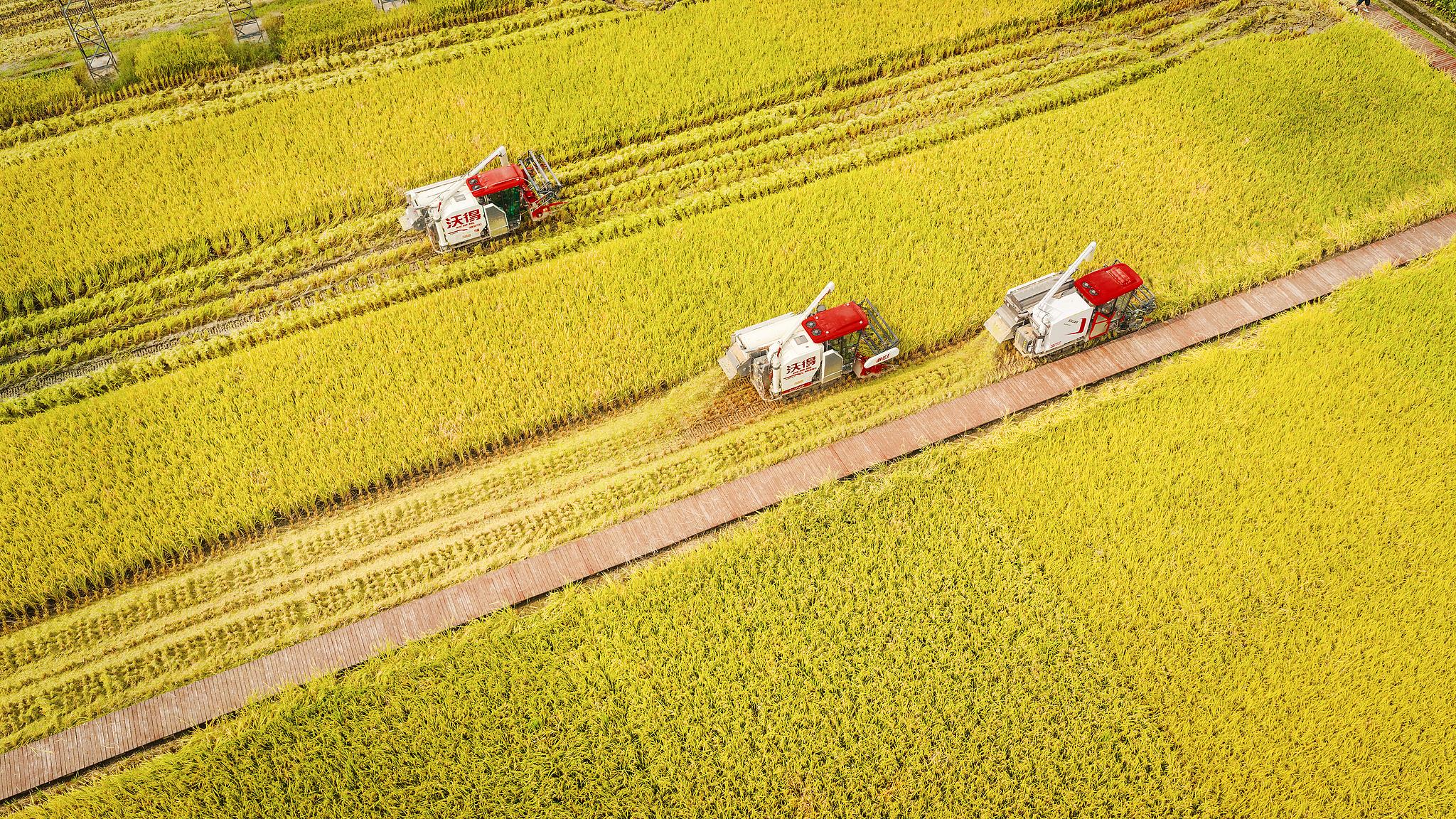 ▲2025年9月14日,四川成都崇州市隆兴镇十万亩粮食综合示范基地水稻喜获丰收。