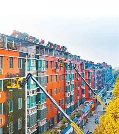 ▲老旧小区改造是提升居民居住品质、保障居民安居乐业的重要举措。图为安徽芜湖繁昌区,工人在进行老旧小区改造。