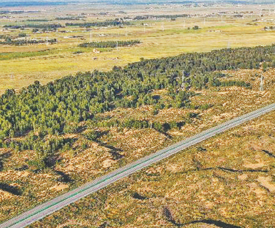▲“十四五”时期,“三北”工程攻坚战取得阶段性成效。图为内蒙古库布其沙漠北缘锁边林带。
