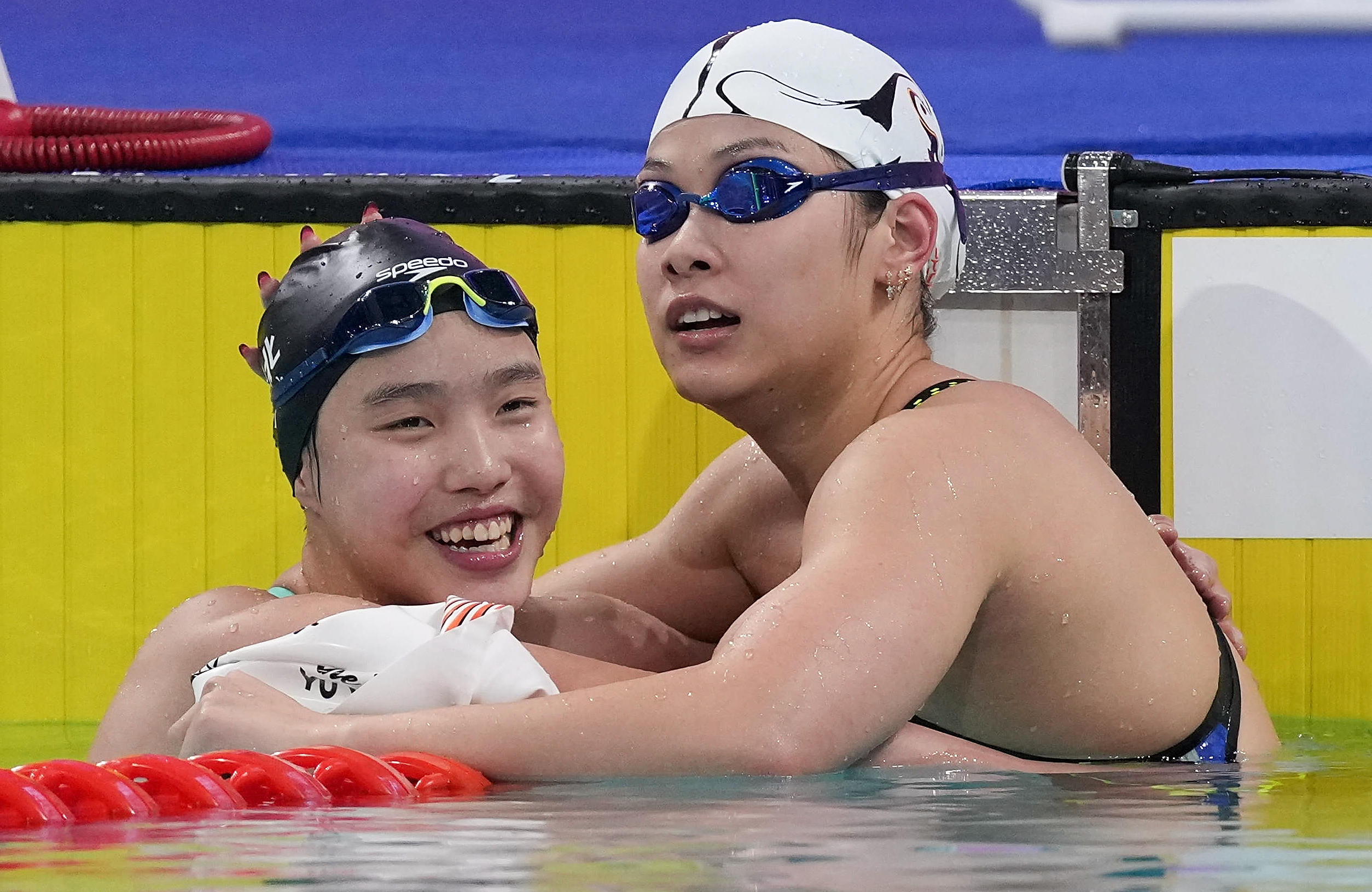▲11月11日,河北队选手于子迪(左)在比赛后与浙江队选手余依婷拥抱致意。于子迪打破亚洲纪录获得冠军,余依婷获得亚军。新华社记者 薛宇舸 摄
