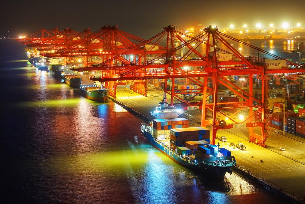 ▲2024年12月14日晚拍摄的江苏省连云港港集装箱码头(无人机照片)。新华社发(王健民摄)
