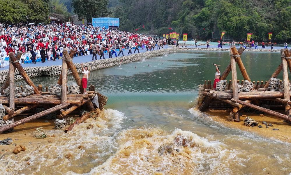 ▲2025年4月4日都江堰放水节,堰工砍断杩槎的绳索后,岷江水奔流而下。新华社记者 江宏景 摄