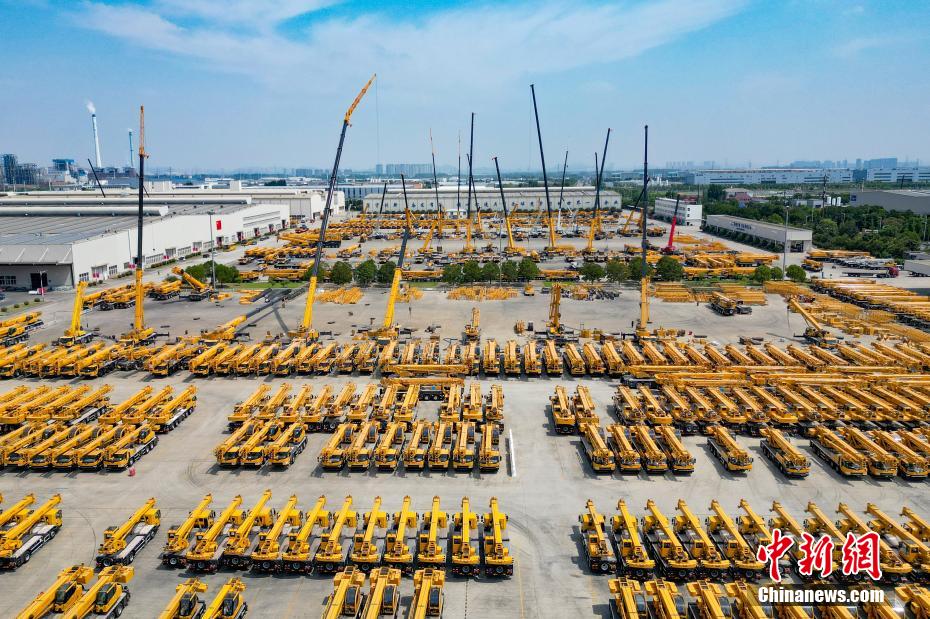 ▲资料图:徐工集团生产车间外停放的起重机。(无人机照片)泱波 摄