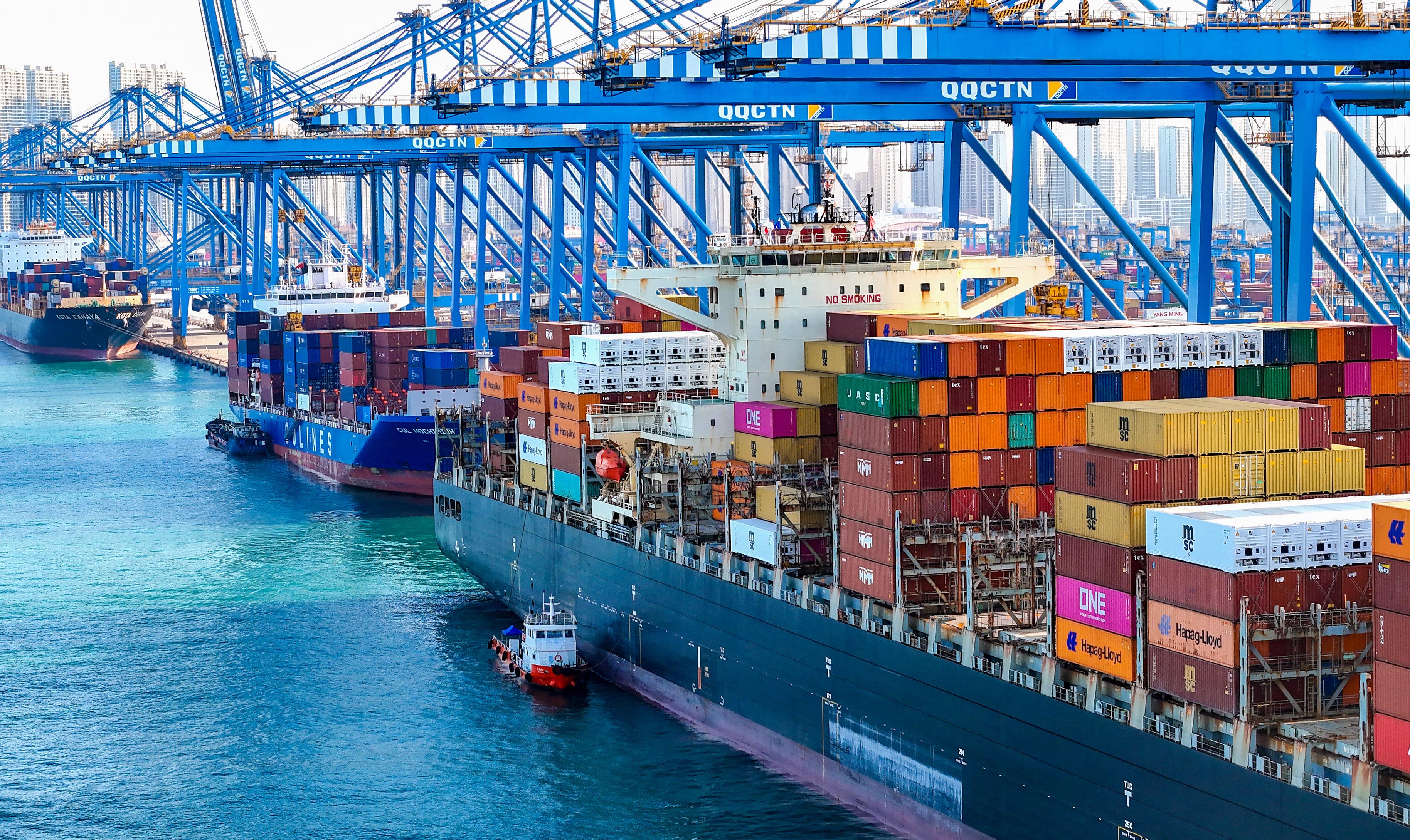 ▲货轮在山东港口青岛港全自动化码头装卸货物。
