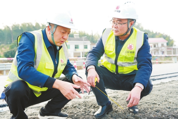 ▲宋涛(右)在桃江县G536线路段大修工程现场。湖南日报全媒体记者 张佳伟 摄