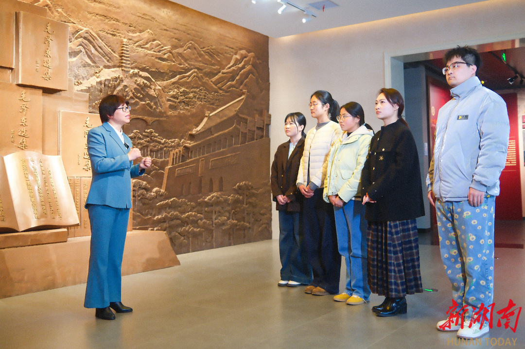 ▲2025年12月31日,湘潭大学“大思政课”实践教学基地——毛泽东思想专题展的展厅内,李伏清(右一)在为学生进行专题授课。湖南日报全媒体记者 童臻熙 摄
