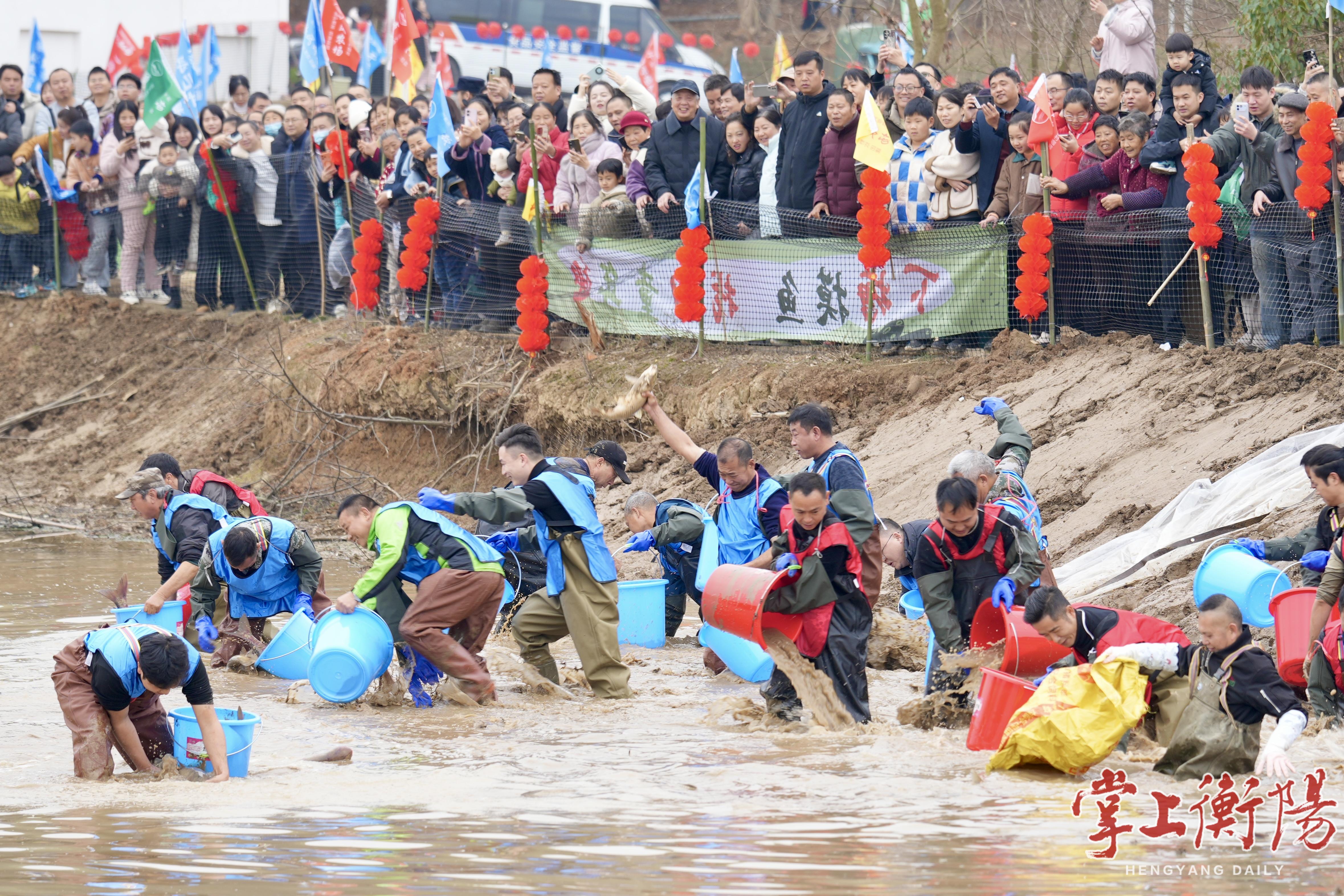 衡阳日报讯(文/图 全媒体记者周琪 周围 通讯员唐兰荣)1月25日上午10时,在珠晖区东阳渡街道高栗村,随着“开塘”号令响起,东阳渡街道“干塘节”在火热气氛中拉开序幕。市民游客冲入半干的鱼塘,泥水飞溅中,在惊呼与欢笑间捕获一条条肥硕的鱼儿。