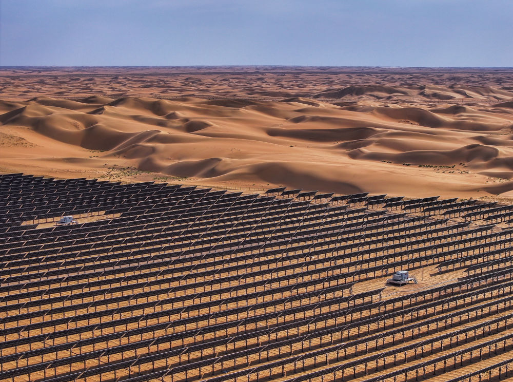 ▲这是2025年6月5日拍摄的位于内蒙古巴彦淖尔市磴口县的乌兰布和东北部新能源基地100万千瓦光伏先导工程项目(无人机照片)。该项目地处乌兰布和沙漠。新华社记者 连振 摄
