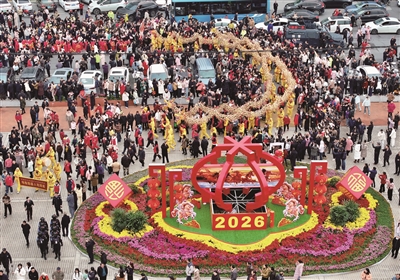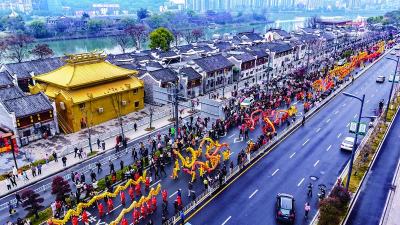 由回雁峰广场出发,经福寿广场、福寿街,一路蜿蜒至雁城之星摩天轮下,壮观的巡游队伍所到之处,皆汇成一片欢乐的海洋。现场人山人海,鼓乐齐鸣,金龙飞舞,雄狮腾跃。家长们纷纷举起怀中的孩童争相触摸狮头,在欢笑声中讨一个“鸿运当头”的好彩头,将新春的福气接回家。(唐京鸿)