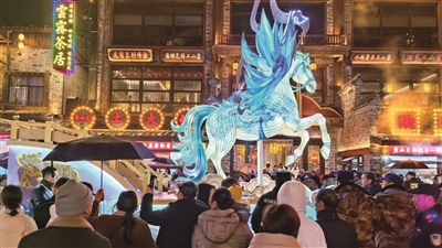 ▲白马开道花车,为游客送上一马当先、马到成功的祝福。