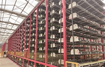 ▲霞流镇智能育秧工厂内,多层秧盘循环流转。 ■通讯员 秦玉 摄