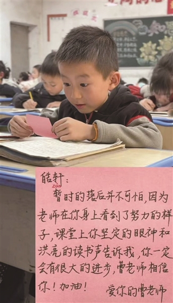 在白果镇中心完小,一个小男孩拿着一张彩色便签,低头看了很久。便签上写着:“课堂上你坚定的眼神告诉我,你一定会有很大的进步。”落款是:爱你的曹老师。