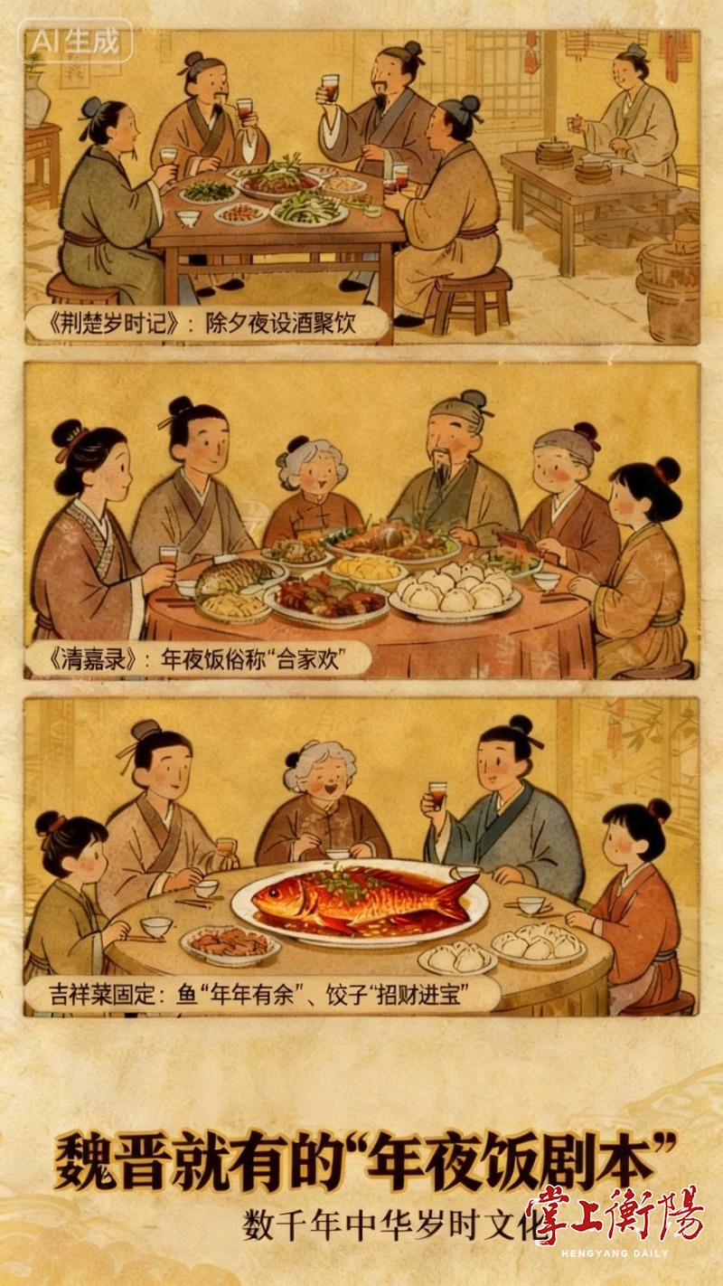 每个人都有自己的来时路,每个习俗也有自己的“成长史”。衡阳年夜饭的根,深植于数千年的中华岁时文化里。宗懔《荆楚岁时记》记载,早在魏晋南北朝时期,年夜饭的雏形就出现了,除夕夜设酒聚饮之风始盛,宫廷和民间都爱凑这个热闹。民间的年夜饭是家家备“肴蔌”,《荆楚岁时记》说得明明白白:“岁暮,家家具肴蔌,诣宿岁之位,以迎新年”。肴蔌指的是山肴野蔌,即各类蔬菜。这便是年夜饭最早的文献佐证。