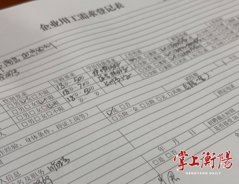 ▲一张用工登记表,密密麻麻记录着岗位信息。