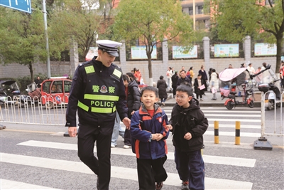 ▲执勤民辅警护送小学生过马路。 (市公安局交管支队供图)