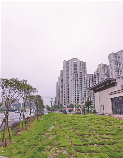 挖坑、栽苗、培土、浇水、铺草坪……园林工人分工协作、有条不紊。傍晚时分,最后一块草皮铺设完成,整个施工历时约10小时。曾经杂乱的菜地不见了,取而代之的是600平方米的草坪缓缓铺开,一株株红叶石楠笔直挺立,17个红花檵木球错落分布,一个干净清爽的小景观在路口悄然呈现。