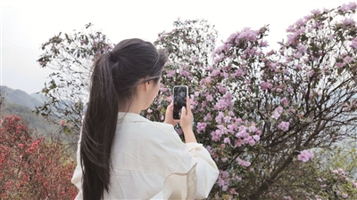 ▲游客用手机定格鹿角杜鹃的美。通讯员文雅婷 摄